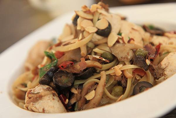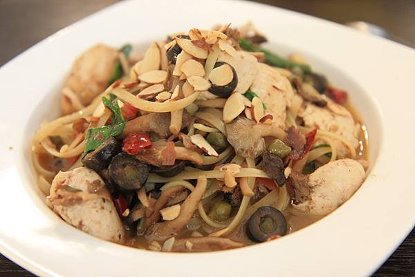 我的鯷魚野菇雞肉麵(NT$280)非常的好吃,鯷魚之於西式料理,就如蝦醬之於泰式料理一樣,有著不同飲食文化的人不能理解,但當地人深愛不已的奇妙滋味,喜歡嚐鮮的我跳過其他常見的菜色,選了這道平時菜單中少見的料理,那炒過的醬汁裡混合了鯷魚、黑橄欖、綠橄欖的鹹,還有辣椒的辛及百里香的香氣,大大的讓麵條和雞肉升級成無敵美食,再灑上杏仁片增添堅果香氣及脆脆的口感,每一口都讓我深怕這是最後一口,讚!