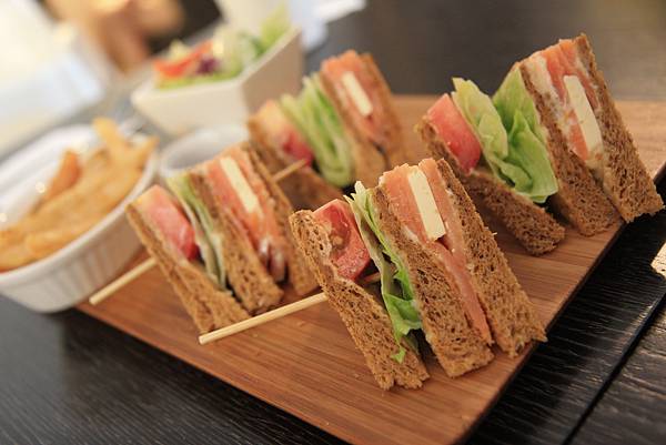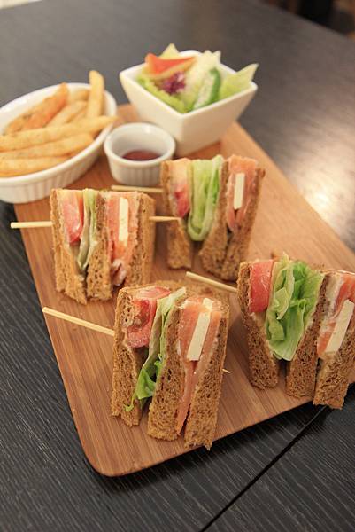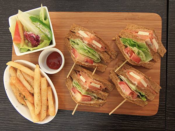 挪威燻鮭魚乳酪三明治(NT$260)切成四等份的三角型,附上沙拉及薯條漂亮的裝盛在木枮板上,三明治的滋味就如同擺盤一樣,以食材本身的單純鮮滋味,讓每一口都讓嘴裡充滿著摘採自大地的活力。