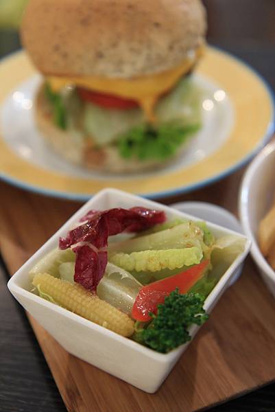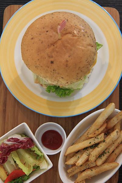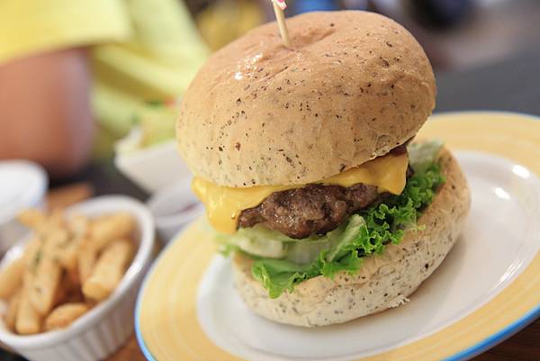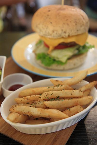 超牌牛起司漢堡(NT$260)多了個圓盤,以同樣的方式裝盛,剛起鍋的金黃薯條灑上摻雜香料的鹽巴,美味度大提升,加上鮮嫩的沙拉一起食用不只健康美味,也讓心中因吃了油炸物的罪惡感稍減,最後再一口咬下起司漢堡,讓溶化了超司的溫熱牛肉在嘴裡肉汁四溢,並由鮮脆的生菜帶來一口清爽感,簡單,但好吃。