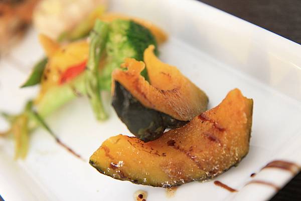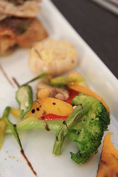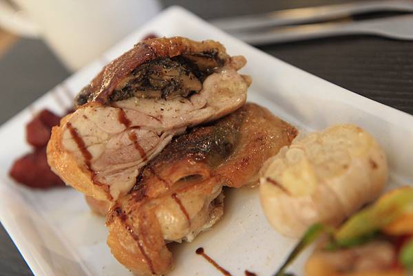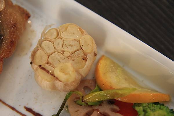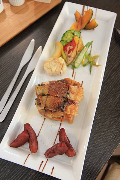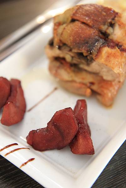 限量脆皮松露野菇雞腿排(NT$580),在讓Keith等了半小時後,以優雅的法式擺盤方式送上桌,那鑲嵌了松露及野菇的土雞腿,雖然一點都不脆,但結實香嫩的口感裡有著讓人無法忽略的松露香氣,讓土雞腿頓時成了料理東西軍裡的特選食材般美味,一旁的紅酒釀蘋果則保留著水果甘甜並加入了紅酒的微醺香氣,烤大蒜及蔬菜不僅在蔬菜原味中加入了火烤香氣,而且一點都沒有烤蔬菜常見的乾澀口感,水份完全被鎖在裡頭,真是一絕,就連烤南瓜也很令人驚豔,灑上紅糖後悶烤的南瓜不只濕潤綿密,更多了一層脆脆的糖衣,口感上近以於烤布蕾,超讚!