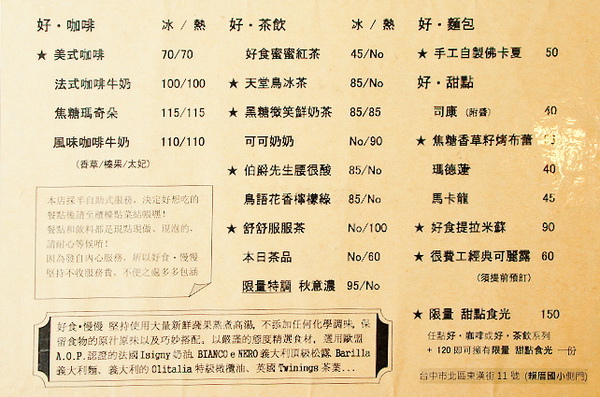 這裡鄰近崇德路的辦公大樓,加上用餐位置不多,平日的用餐時間就已一位難求,假日時若沒訂位更難有機會入座,前一晚才臨時預約的我幸運的搶到了週日中午時段最後一個位置,不拿菜單就直接詢問是否還有提供週末的brunch,扼腕的是週末早午餐只供應到十一點,沒關係,給自己一個機會再來一次。拿起A4大小的菜單,正反面翻看著該點什麼好,三明治、漢堡、義大利麵....雖然菜單上只是文字,但句句都在心裡形成一個影像,個個都吸引著我,讓人為了不知該如何取捨發愁。