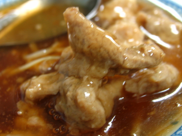 能吸引各縣市遊客遠地而來的原因就在於那傳統的原味肉羹味道,這裡的肉焿是用新鮮豬拍打成較為軟嫩的肉漿,再將鮮肉漿裹上紅蕃薯粉入水煮的現做肉焿,與一般剁攪綿密的肉漿加上魚漿而成的肉焿大有不同,瘦肉的肉質比較有嚼勁且滑嫩,就連那勾芡過濃稠的湯汁都是清澈透明狀,和一般柴魚、木耳、筍絲混濁的湯汁大大不同,舀一口帶湯汁的肉焿入口,大塊的肉條吃起來過癮極了,不論是加入飯、麵或米粉,都讓人一碗接一碗停不下口。